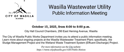 The City of Wasilla Public Works Department invites you to attend a public information meeting. Learn more about ongoing projects at the Wasilla Wastewater Treatment Plant; specifically, the Sludge Management Project and the Wetland Waste Treatment System (Effluent Discharge) Project. For more information see the City website: https://www.cityofwasilla.gov/439/Public-Notices